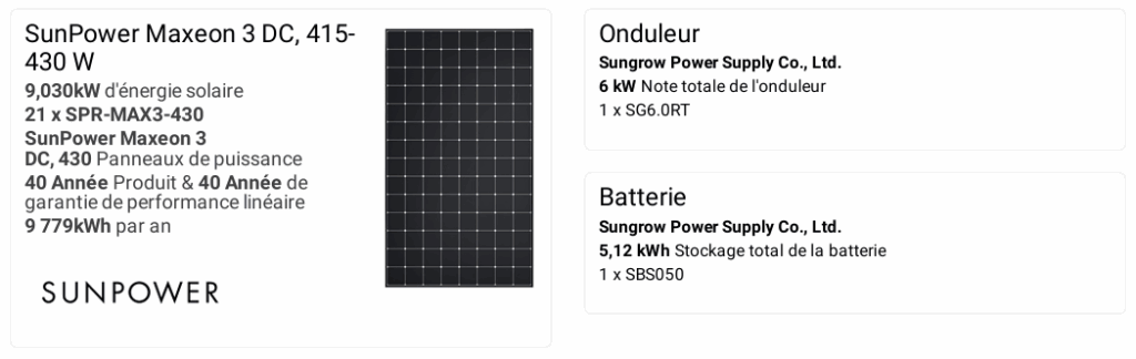 Le projet de M. Brunetton repose sur un choix de panneaux solaires SunPower Maxeon 3 (9 kWc), réputés comme étant parmi les plus performants et fiables au monde.