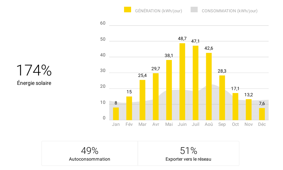 Avec un taux d’autoconsommation de 49 %, près de la moitié de l’électricité produite est consommée directement dans la maison, réduisant de manière significative les factures mensuelles. Le surplus est revendu au réseau, générant un revenu supplémentaire et augmentant la rentabilité globale du projet.