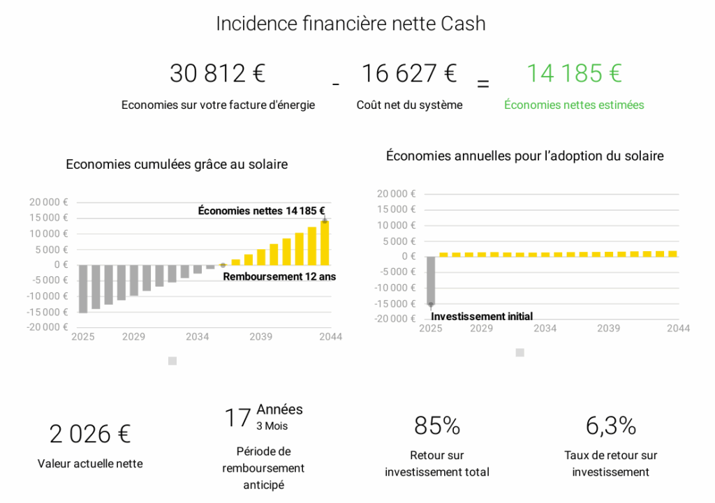 Le projet de M. Brunetton représente un investissement net de 16 627 €, pour des économies nettes estimées à 14 185 €. La période de retour sur investissement est d’environ 12 ans, avec un taux de retour sur investissement (TRI) de 6,3 %.